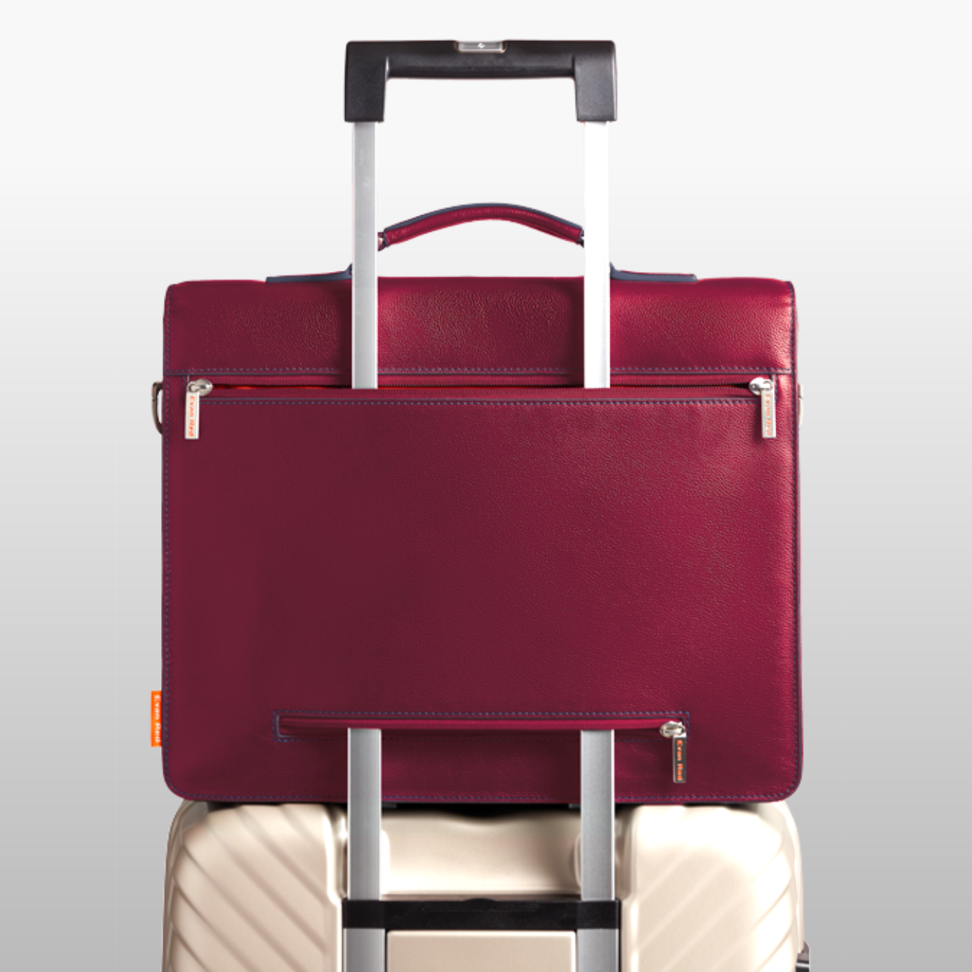 The Amsterdam briefcase features a dual-zip luggage sleeve, allowing you to effortlessly secure it to your trolley
