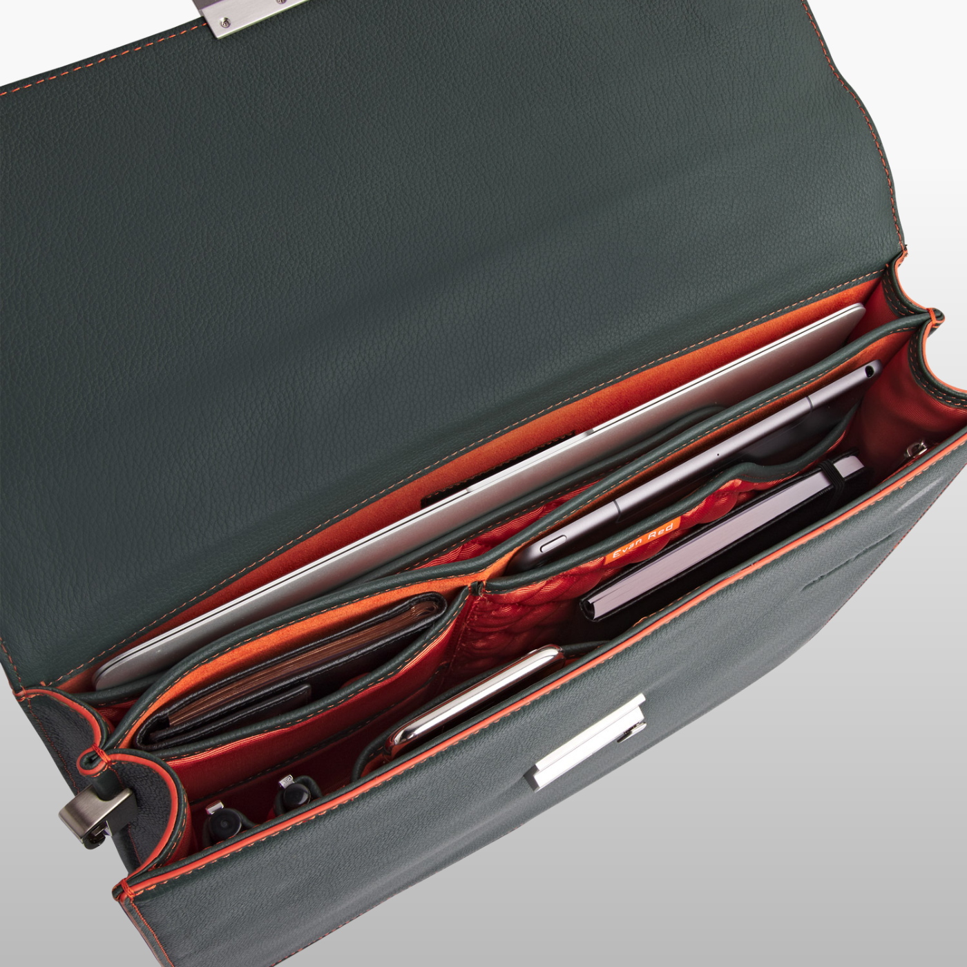 The Amsterdam Briefcase fits a MacBook 13" / 14", iPad, notepad, and daily essentials with 13 smart interior pockets. Larger laptops (up to 15.6") fit in the main compartment, but not the padded section. Includes a removable 3cm (1.18") wide strap.