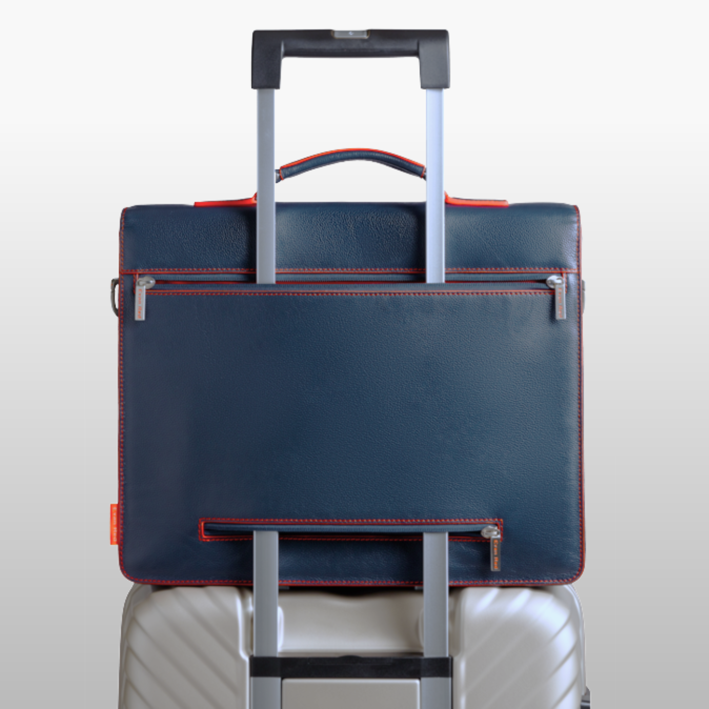 The Amsterdam briefcase features a dual-zip luggage sleeve, allowing you to effortlessly secure it to your trolley