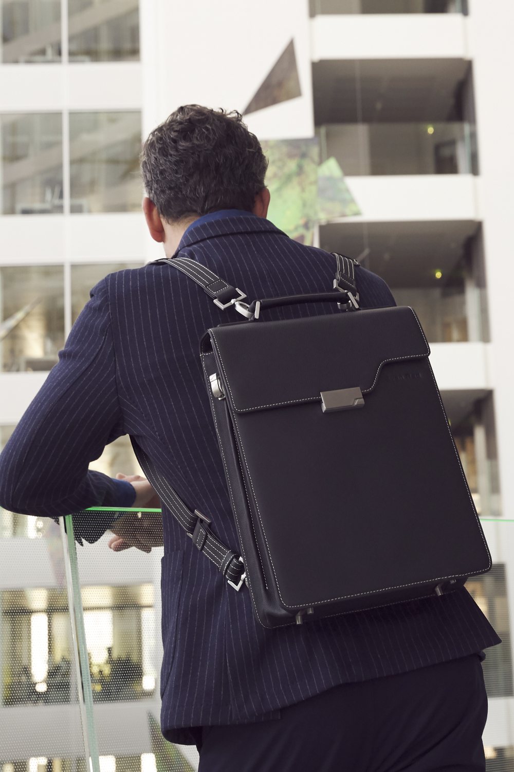 The London Backpack fits a MacBook 13" / 14", iPad, notepad, and daily essentials with 13 smart interior pockets. Larger laptops (up to 15.6") fit in the main compartment, but not the padded section. Includes a removable 3cm (1.18") wide strap.